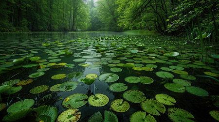 Tranquil pond in lush forest with floating lily pads and water lilies