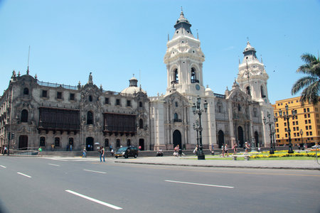 The Metropolitan Cathedral of Lima, Peru, features colonial architecture with a baroque and neoclassical design. Its twin bell towers, large entrance, and ornate facade dominate the historic city center