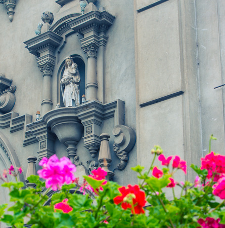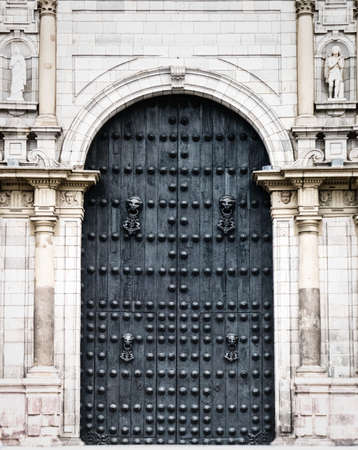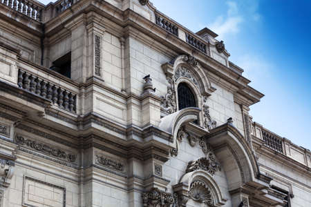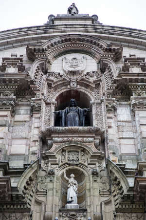 Detail of main facade of Cathedral Basilica of Lima in Lima, Peru