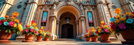 Grand entrance of ornate church with vibrant flowers in pots in bright sunlight. That the image is generated using AI.