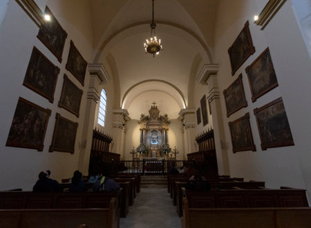 Quito, Pichincha / Ecuador - November 1 2019: People praying sitting in the church of El Sagrario in the historic center of Quito