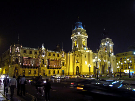 The Basilica Cathedral of Lima at night, it is a Roman Catholic cathedral located in the Plaza Mayor in Lima, Peru