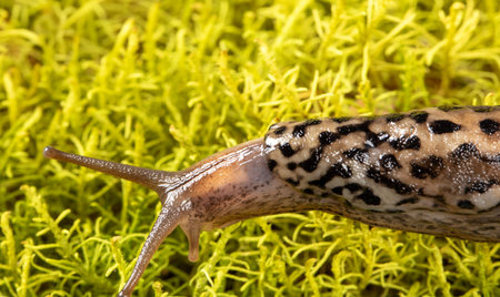 A close-up of a spanish slug crawling against a vibrant green moss backdrop. The slug's textured body contrasts beautifully with the lush moss, showing the intricate details of nature.