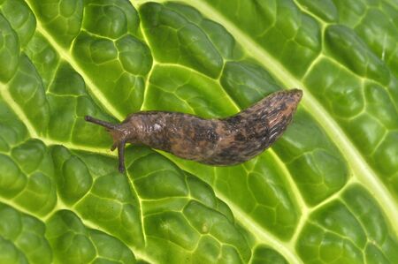 Slug close-up on a cabbage leaf