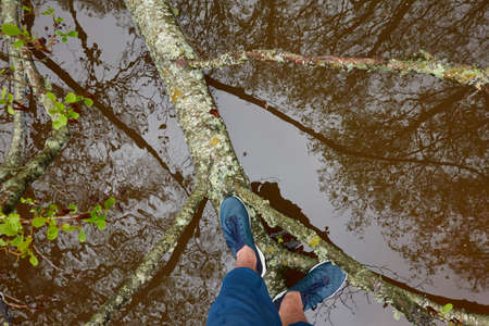 Man standing on tree log in a forest park. Blue jeans and trekking boots. River. Green plants, moss, fern. Spring, early summer. Nature, tourism, hiking, nordic walking, healthy lifestyle
