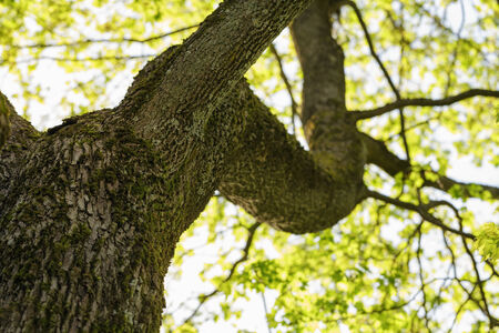 Branches of an old oak tree covered with moss.
