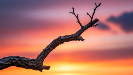 Dry tree branch on colorful sunset sky background with copy space.