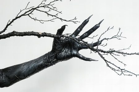 Halloween concept. Scary zombie hand with dead tree branch on white background