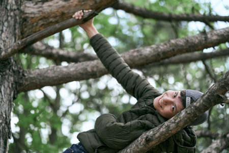 teenage boy poses on a tree, lying on a big branch and dreaming
