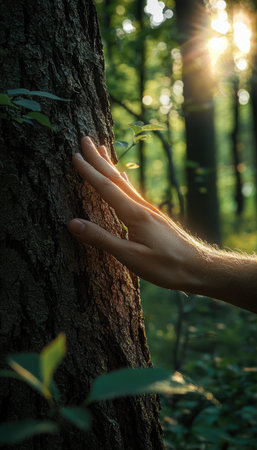 Amidst a tranquil forest, a hand gently touches a tree trunk, symbolizing a deep connection with nature. the image evokes themes of energy, sustainability, and environmental dependency, the serene beauty of green forests.