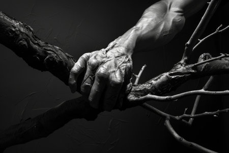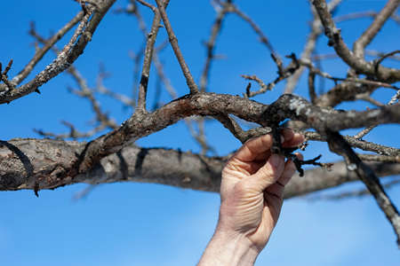 closeup of a male hand touching bare dead branch against the blue sky