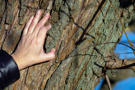 Female hand touching old tree bark, outdoor closeup shot