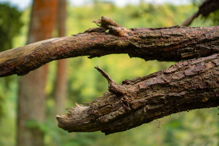 Close up of the trunk and branches of a pine tree that are no longer intact in some parts with a bokeh background.