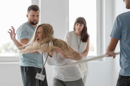 Business people making team training exercise during team building seminar having fun.