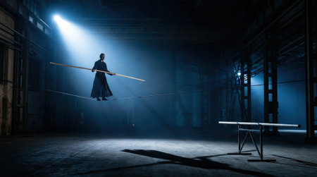 A person is walking on a tightrope over a cliff. The image has a dark and moody atmosphere, with the person's silhouette against the backdrop of the cliff. The tightrope walker's focus