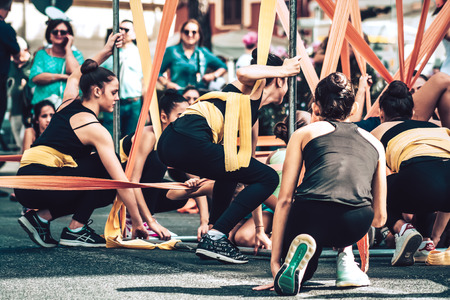 Rome Italy September 29, 2019 Celebrations of the 150th anniversary of the Italian gymnastics federation, public demonstration of young gymnasts in the streets of Rome near the Coliseum