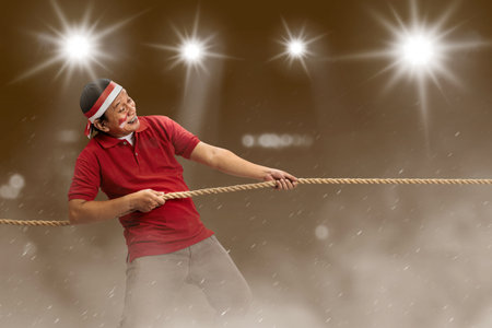 Two Indonesian men celebrate Indonesian independence day on 17 August with the tug of war contest. Indonesian independence day