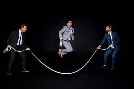 businessmen holding rope while mature barefoot asian businesswoman jumping