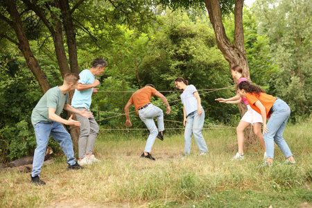 Team building. Group of happy people playing spider web game outdoors