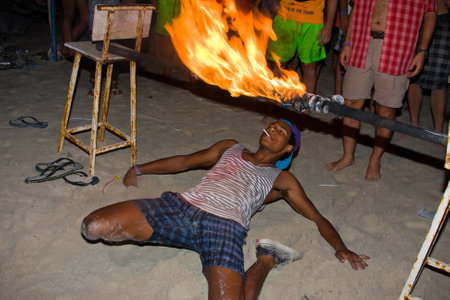 PHANGAN - JANUARY 08 : There are about 10,000 people every month at this Phangan beach Full moon party, on January 08, 2012 in Koh Phangan , Thailand . Fire dancer on a beach - blur