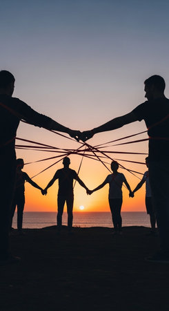 Silhouette of a group of young people holding hands together on the beach during sunset