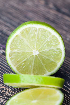 lime slices on wooden table. Detox diet, limes Backgrounds, Close up shot, fruit macro photography