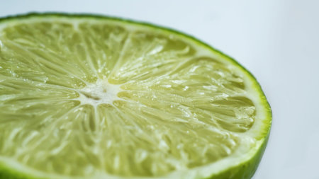 This image showcases a cross-section of a vibrant green lime, revealing its textured interior. The close-up shot highlights the fruit's cellular structure and natural patterns. The composition, with its smooth background, is suitable for various commercial uses, including illustrations and editorial content that requires a fresh and healthy vibe.