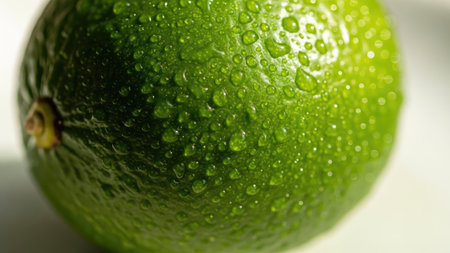 A close-up shot showcases a vibrant green lime, its textured surface covered in glistening water droplets. The image features high detail and vivid color, utilizing shallow depth of field. The fruit sits against a white background, lit by bright, natural light. This photo would be suitable for use in food-related advertising or editorial content.