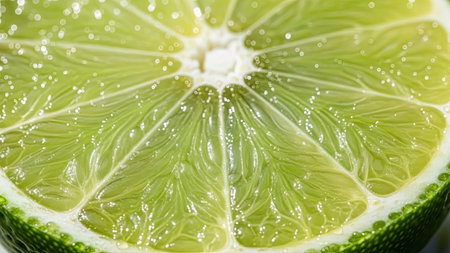 This close-up showcases a freshly cut lime, revealing intricate textures and a vibrant green color palette. The composition highlights the fruit's internal structure and translucent qualities. Suitable for various applications, this image could be utilized for food-related projects or visual content.