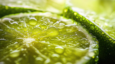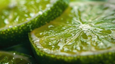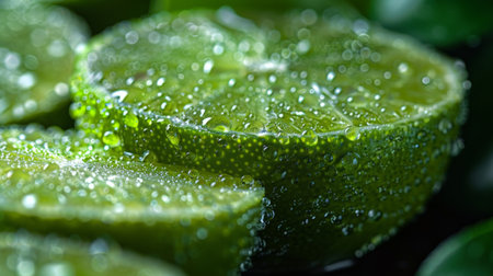 Explore this close-up image of fresh lime slices adorned with glistening water drops, showcasing the vibrant green color and zesty freshness ideal for culinary inspiration.
