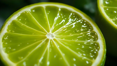 A vibrant lime wedge adorned with glistening water droplets, capturing the essence of freshness and zesty flavor.