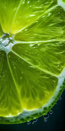 A macro shot reveals a sliced lime, showcasing vibrant green hues and intricate textures. Water droplets cascade, emphasizing freshness. The composition is set against a dark backdrop, creating high contrast. This image is suitable for culinary, health, or beverage-related projects, offering visual appeal.