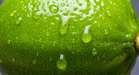 Macro texture of fresh ripe lime slices with water drops, close up view. AI generated.