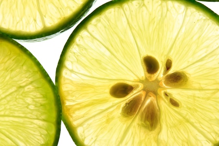 Macro photo of ripe tasty lime slice on white background. Abstract background of exotic tropical fruits and berries
