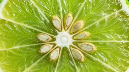 This close-up image presents a halved lime, showcasing its interior structure with green and white hues. The shot highlights the seeds in the center, and the texture of the fruit, indicating a natural setting. Suitable for various applications, it could be used in advertising or educational materials.