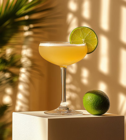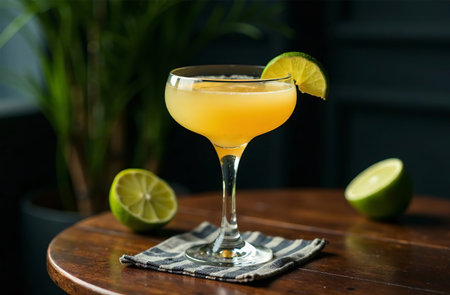 classic Daiquiri served chilled cocktail glass showcasing blend white rum lime juice and simple syrup. drink garnished lime wheel emphasizing its refreshing appeal.