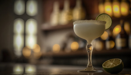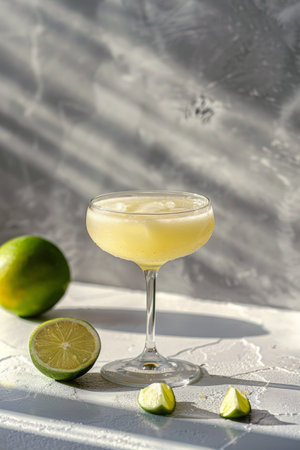 A vibrant margarita is served in an elegant glass, garnished with a lime slice, capturing the essence of a sunny summer day, ideal for outdoor gatherings and celebrations