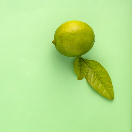 Flat lay with ripe lime on green background