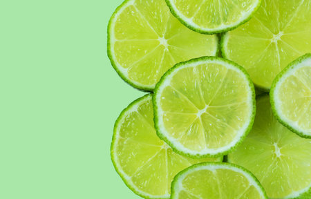 Abstract green background with citrus-fruit of lime slices. Close-up.