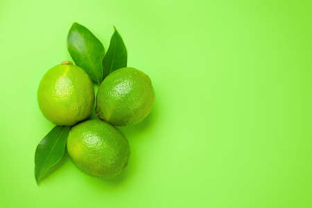 Fresh ripe lime citrus fruits on green background. Top view flat lay with copy space