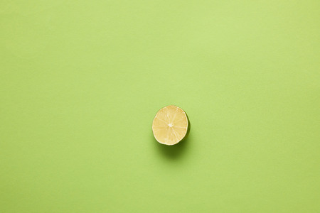 One fresh green lime overhead view lemon background