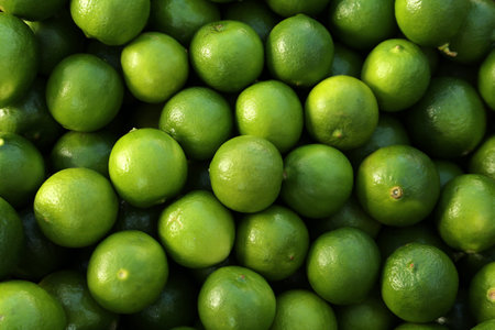 Fresh ripe green limes as background, top view
