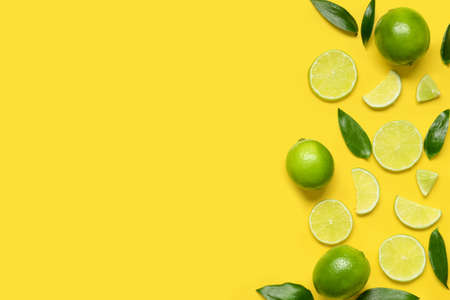 Fresh limes and leaves on yellow background. Space for text