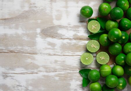 flat lay natural fresh lime with whole and cut lime slices, green leaf on white wooden table background. top view.
