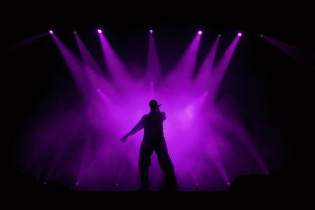 Silhouetted singer captivating the audience on stage, surrounded by vibrant purple lights and swirling smoke, creating an electrifying atmosphere
