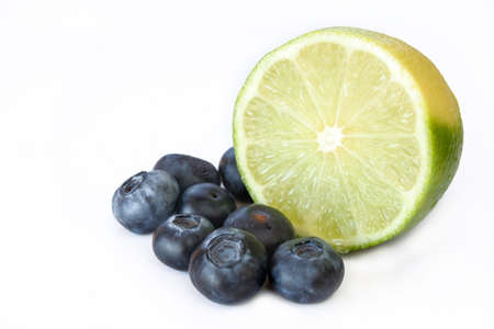 Lime and blueberries isolated on a white background. Used selective focus and a shallow depth of field.