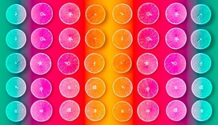 Abstract background of half cut organic oranges in row on abstract multicolored background. Various colors