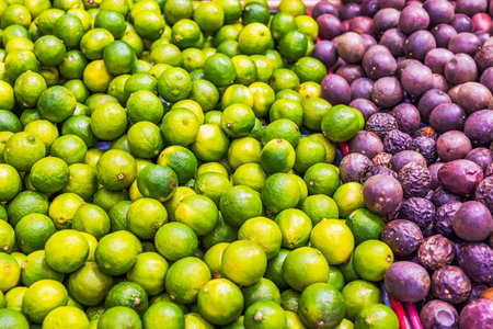 Close-up view of produce shelves with lime and passion fruit in the grocery section of a supermarket. Sweden.