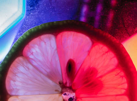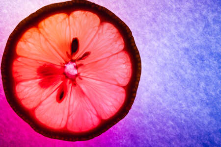 A thin lice of lemon macro capture, colorfully illuminated and back lit