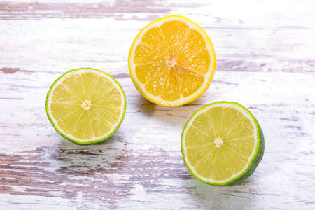 Natural fresh lime and sliced, green leaf isolated on white wooden background.